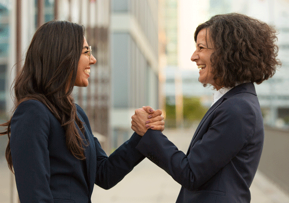Image: Two businesswoman facing each other and smiling while clasping their left hands.