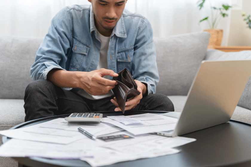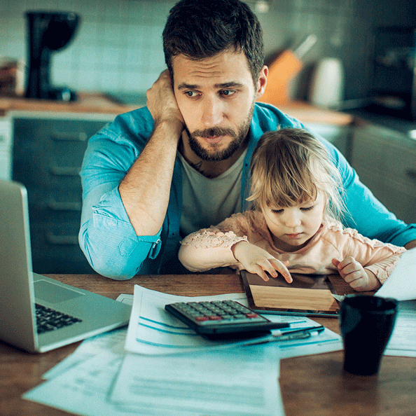 Image: Financially stressed father, holding his daughter, leaning on a kitchen table surrounded by bills.