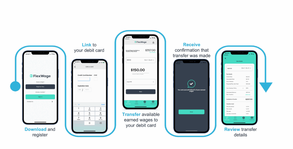 Image: Five screenshots of the FlexWage OnDemand Pay EWA mobile application: (1) download and registered, (2) link to your debit card, (3) transfer available earned wages to your debit card, (4) receive confirmation that the transfer was made, and (5) review transfer details.