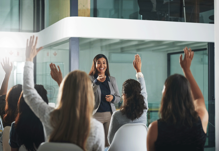 Image: Friendly smiling businesswoman facing the camera and answering questions of the team, who are in the foreground with their hands raised to ask questions.